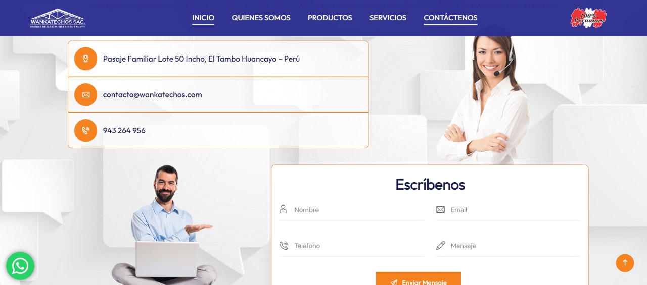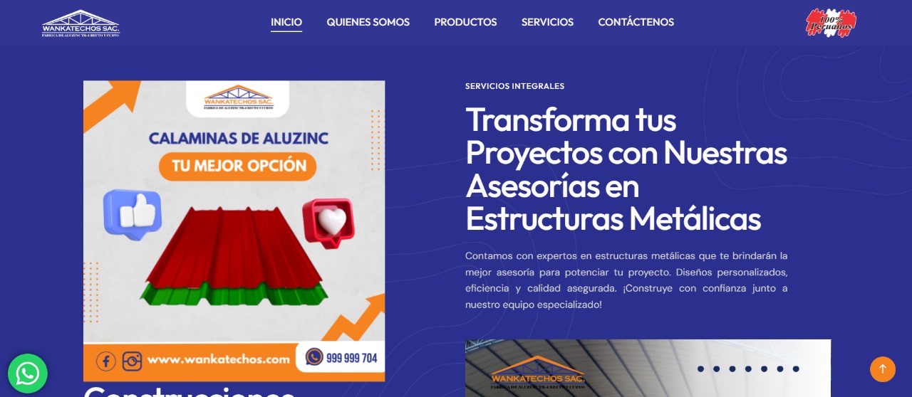 - Creamos una página web moderna y funcional para Wankatechos, diseñada para resaltar las ventajas de sus calaminas de aluzinc TR-4 y TR-5. La página incluye secciones detalladas sobre la empresa, productos, servicios, testimonios de clientes y un formulario de contacto intuitivo.